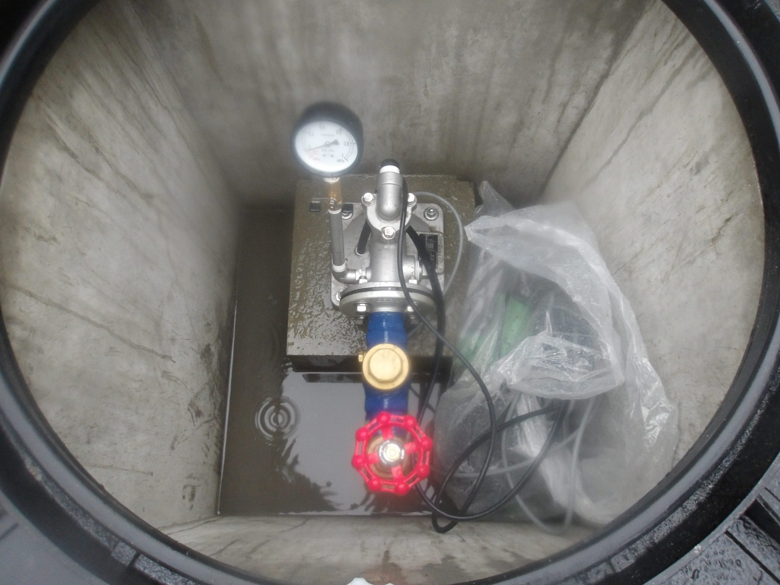 佐賀県某所で行っていた、さく井工事が完了し 揚水設備工事(水中ポンプ取付)を行いました。 井戸には桝を設置し、マンホールを取り付けました。